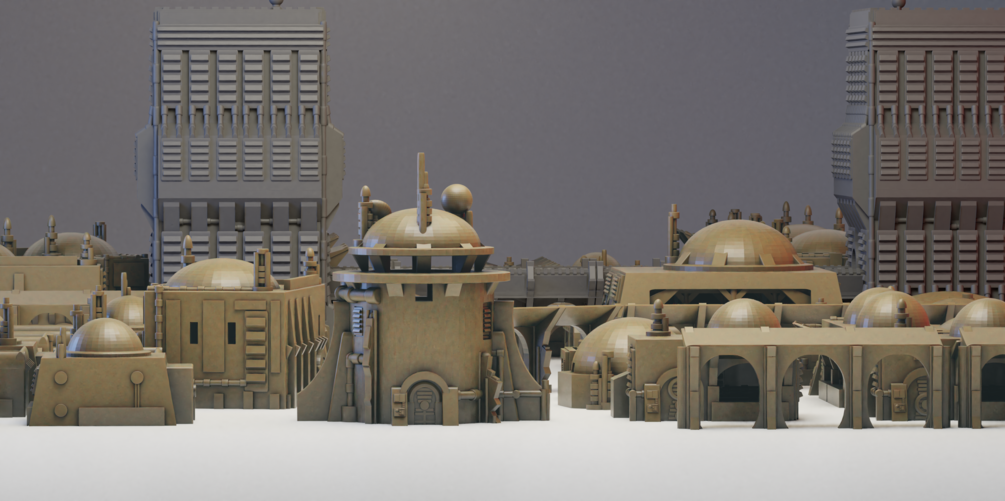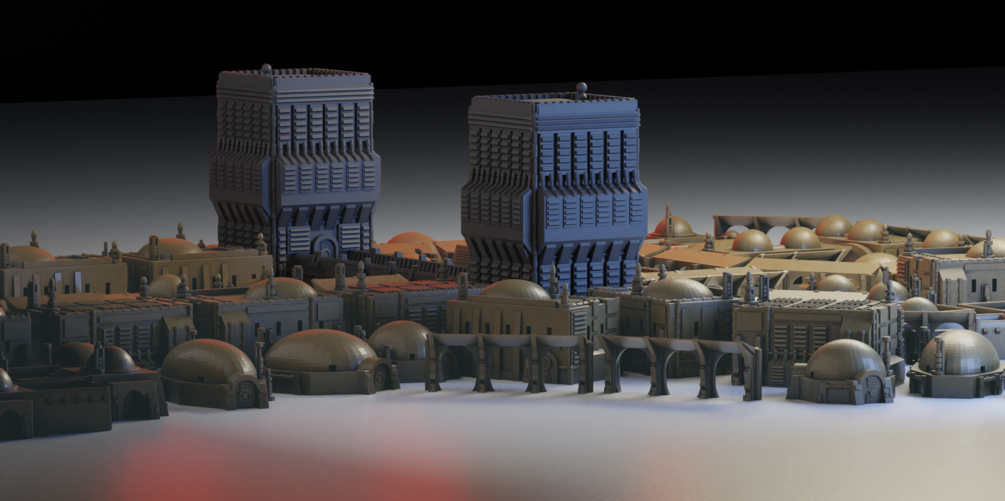 6mm sci fi buildings designed to be printed flat on the bed of FDM printers, can also be printed using resin printers.